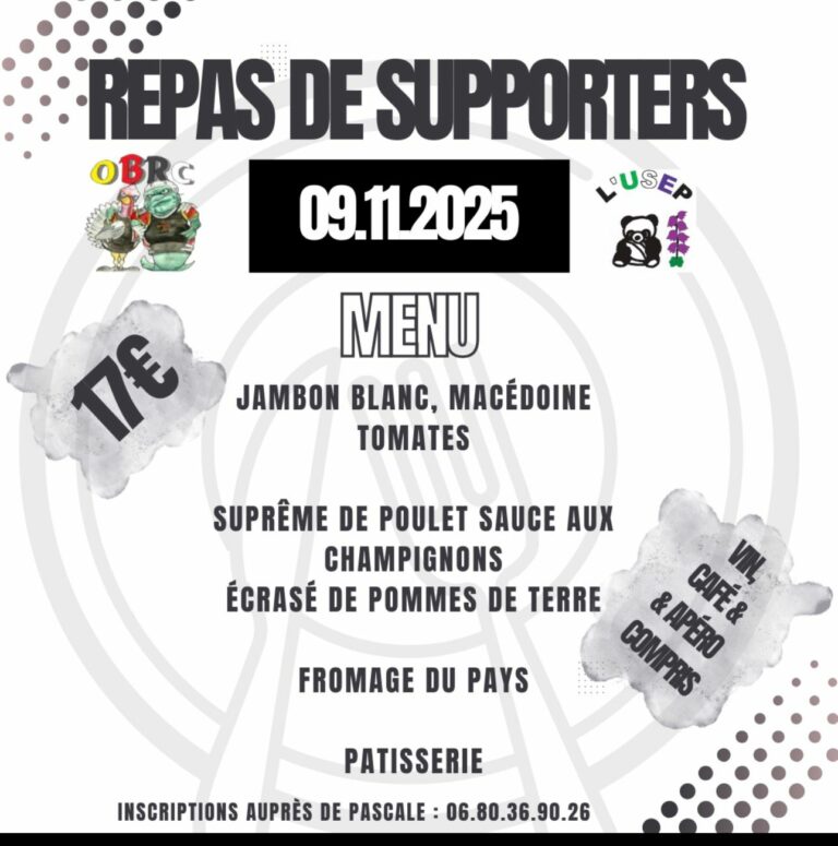 A l’occasion de deby contre l’USEP ce dimanche à Bordères, le club organise un repas de supporters. Inscriptions auprès de Pascale : 06.80.36.90.26. Amis supporters le nombre de place est limité, alors ne tardez pas a vous inscrire.